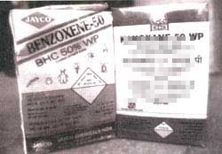 (a)BHC溶液無色透明の液体で、ベンゾール臭があり、水には溶けない。有効成分はγ-BHCで1%含まれています。主として貯穀害虫に使用されますが、これを更に濃厚なものとして防疫用にも用いられます。(b)BHC粉剤250 メッシュ以上の白色微...