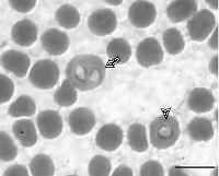 寄生された赤血球の核は周辺に押しやられたり、取り囲まれることがある。