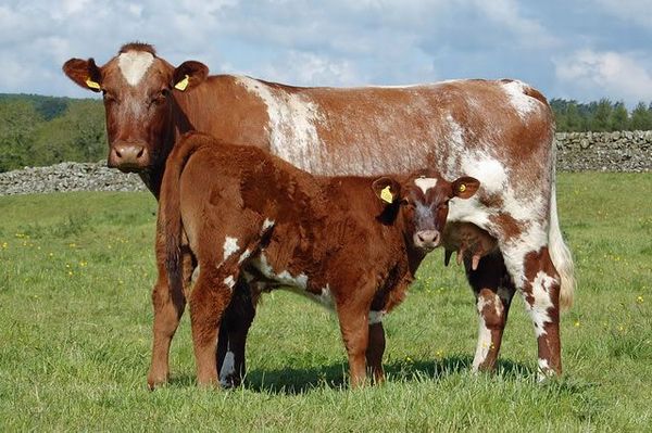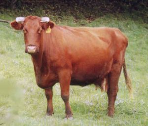 戦前、本邦に輸入されたものは小型で、体高、雌約118cm、雄約128cm、体重、雌約240kg、雄約360kgでした。体型は前軀に比し後軀貧弱な牛で、前がち体型です。