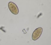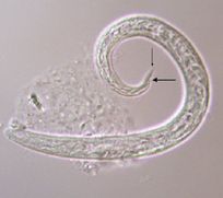 雄の尾翼は左右対称ではない。交接刺は左右の長さが著しく違う。虫卵は、50~70 x 25~37㎛、卵殻が厚く排出時に幼虫を含みます。