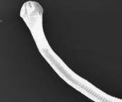猫条虫(Taenia taeniaeformis)、本種も条虫科に属しますが、額嘴が明らかで鉤がおおきいこと、吸盤が突出すること、頸部がなく頭節の直後から片節がはじまること、嚢虫が帯状で片節嚢尾虫という特殊の型であることなどから、Hyda-tigera属に入れられることもありますが、ここではTaenia属とします。