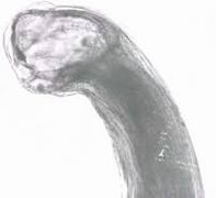 牛回虫:トキソカーラ・ビツローラム(Toxocara vitulorum)、雄25cm、雌30cmに達します。外観は豚回虫に似ています。クチクラが薄く、虫体は半透明で内部臓器が透視でき、雄の尾端に突起があり、頸翼はありません。