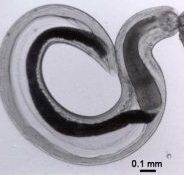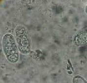 虫卵は両端が鈍円で、おおきさは90~105 x 50~55㎛で無色、十数個の細胞を含みます。