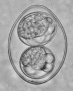めん羊肉胞子虫(Sarcocystis tenella)、スポロシストは楕円形で13~16 x 8~11(平均14.5 x 9.5)㎛、壁は平滑で無色ないしわずかに淡黄色。