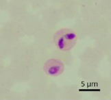 プラスモジウム・ガリナセウム(Plasmodium gallinaceum)、マラリア原虫は赤血球内で無性的および有性的に生殖を行うほか、赤血球以外の細胞でも無性生殖をします。