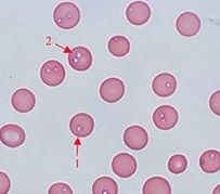 血液には赤血球数・血色素量の著減と、赤血球の大きさ、形態、染色性に貧血性の異常所見が顕著に認められ、赤芽球も出現する。