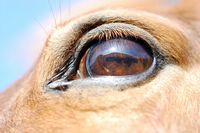 馬、犬、猫、時に牛にも見られるもので、眼圧が亢進して強膜および角膜が膨隆し(球状角膜keratoglobus)、巨眼megalophthalmosとなったもので、眼球が突出する(眼球壁が薄く弱いため眼内圧の亢進によって容易に拡張する)。