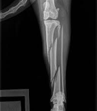 子牛、子馬では髄内釘(特注)または骨プレートを用いて内固定をほどこし、これにThomas副子を併用します。ただし、感染の危険が小さくない。