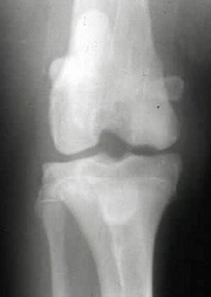 肘関節は側方に転位し肥厚し、屈曲時に疼痛があり、時には捻髪音を発します。一側性または両側性に発生し、間欠的跛行を呈し、犬はたえず肢を休ませています。