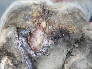 患部には大小さまざまの空隙が形成され、内部に悪臭を発する不潔黒色あるいは灰白乾酪様の角質腐敗崩壊物(蹄膿)を充満しています。