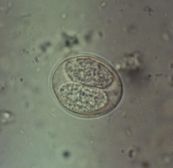 猫イソスポラ(Isospora felis)オーシストの形態は犬に寄生するI.canisに酷似していますが、鋭端がやや突出しています。オーシストは卵円形、おおきさは32~53 x 26~43(平均42.5 x 32)㎛壁は平滑で色は淡黄色な...