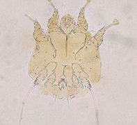 ウサギ吸吮疥癬虫(ウサギキュウセンダニ)(Psoroptes cuniculi)、体は楕円形で黄白色体長は、雄0.4~0.75mm、雌0.37~0.55mm本属の特徴は第1・2・4脚の先端に3節の長い柄のある肉盤(吸盤状のもの)があることで...