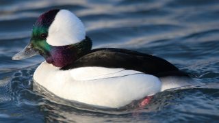 キタホオジロガモより大分小さい小型の鴨でありますが、中々此れも美しいものです。雄は頭の側面から後部にかけて大きい白い部分があるのが特徴で、其れ以外の頭部は羽が長く、紫緑黒色で脊、肩は黒いのですが、頸、胸、腹、脇などは純白で美しいです。風切り...