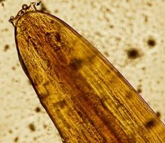 細頸毛様線虫:ネマトジルス・フィリコリス(Nematodirus filicolis)、Nematodirus属の種は比較的大形で、体前部が細い。生時には淡紅色です。頭部先端のクチクラが膨大し、頭胞状となり、その下方に十数本の横すじがあります。