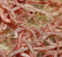 犬肺虫:フィラロイデス・ヒルティ(Filaroides hirthi)、雄2~4mm、雌6~13mm、雄の交接嚢は退化します。