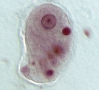 また、肝・脾腫、骨髄うっ血、リンパ節腫脹、腸粘膜潰瘍も認められます。原虫は皮膚、臓器にみられる大食細胞内に多数寄生しています。