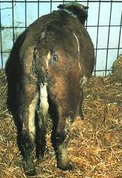 (ⅳ)治療法:右膁部を切開して開腹し、第四胃の捻転を整復し固定する。整復不可能な場合や重度の潰瘍が疑われる場合には、やむをえず第四胃を切開しますが、この場合特に胃液を30l以上失った場合には、一般に予後が悪いとされています。