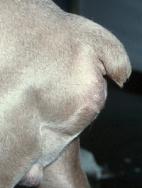 b)虚弱体質による筋の発育不良、あるいは老齢、運動不足、衰弱による筋層の萎縮。