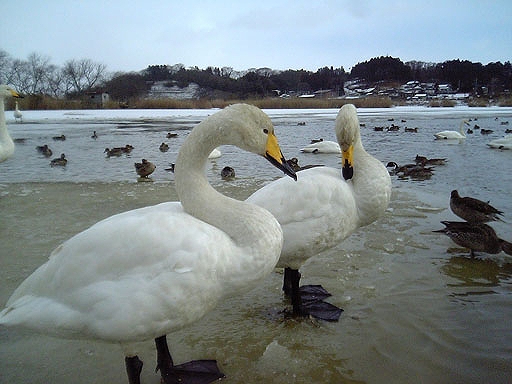 嘴の先は黒ですが、基部から鼻孔まで黄色なものをオオハクチョウといいます。
