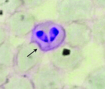 小形馬バベシア(Babesia equi)、小形のバベシアで、赤血球内の虫体は円形、その直径は平均1.69㎛洋なし状の単一虫体は大きさ1.89 x 1.01㎛、対をなす洋なし状虫体は、1.39 x 0.97㎛で、ときには十字形の4個の虫体が...