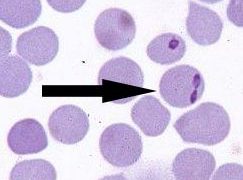 犬バベシア(Babesia canis)、大形のバベシアで、洋なし状の虫体は5 x 2.5~3.0㎛、アメーバ状虫体は径2.0~4.0㎛同一赤血球に多数の虫体(最大16虫体)が寄生することがあります。犬のほかオオカミ、ジャッカルに寄生します...
