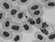 プラスモジウム属種(Plasmodium juxtanucleare)、虫体は赤血球の核に密着して寄生していることがおおい虫体は小形で細胞質が少ない色素顆粒も黒色で微小です。成熟シゾントの中のメロゾイドは2~5個、赤血球および網内系細胞に寄...