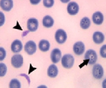 小型ピロプラズマ(Theileria sergenti)、赤血球内の虫体は、急性期には桿菌状、コンマ状、柳葉状など細胞質の少ないものがおおいのですが、慢性期には卵円形などの細胞質の多い虫体が増える。赤血球内虫体の形態ではT.mutansと区...